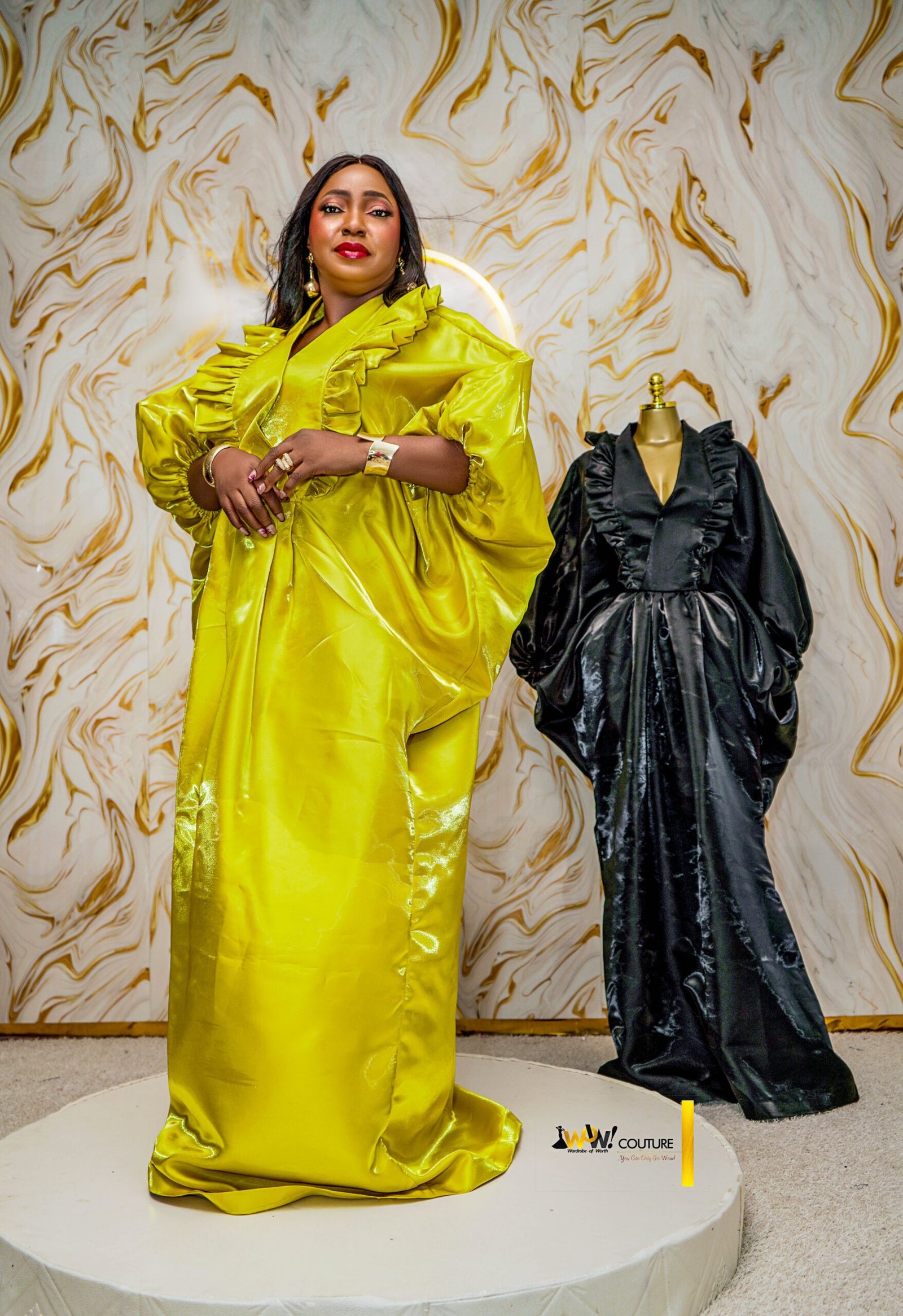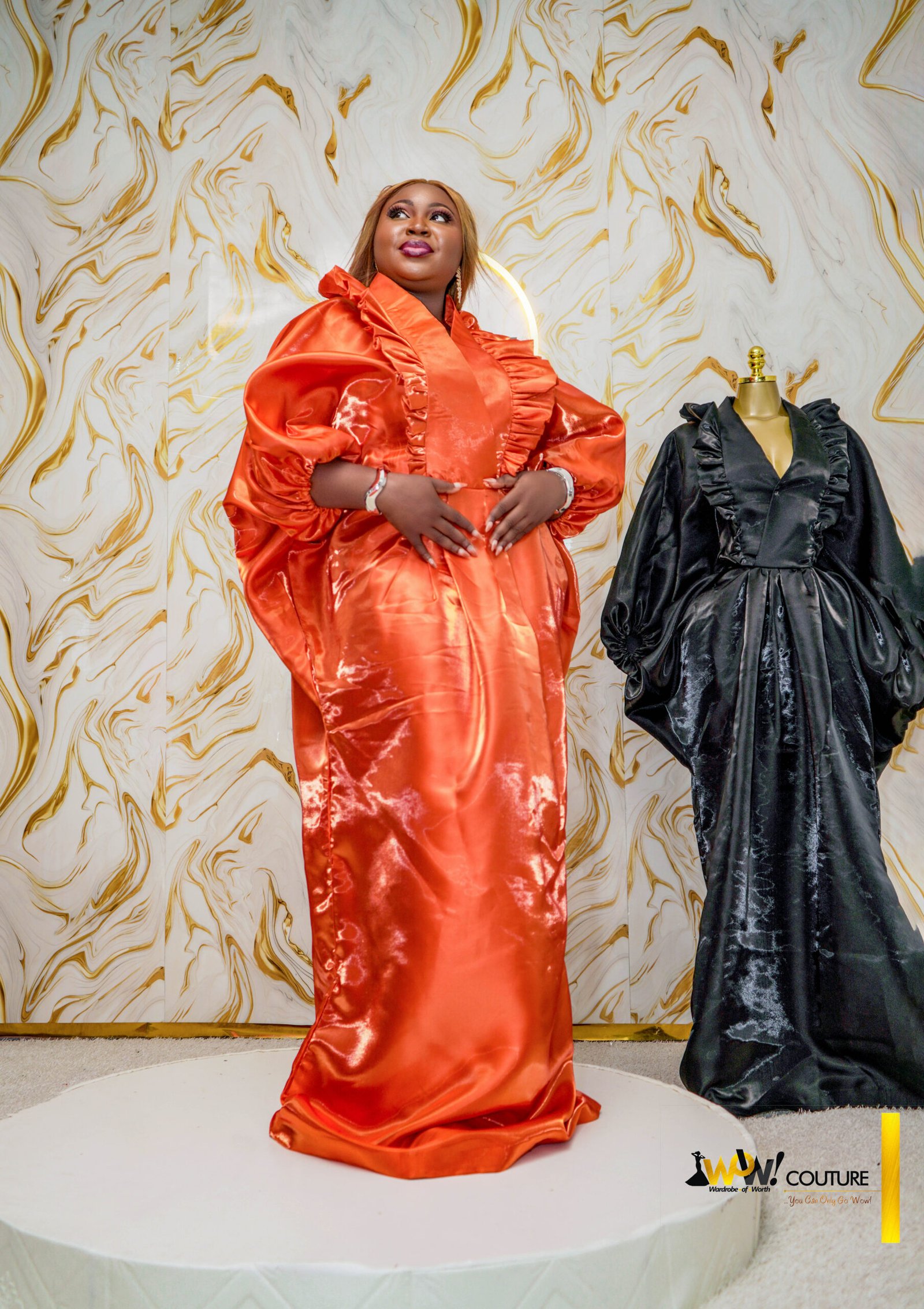 Exude effortless luxury in this high-shine satin kaftan, a masterpiece of volume and texture. Designed to capture and reflect light with every movement, this gown is the epitome of modern royalty.