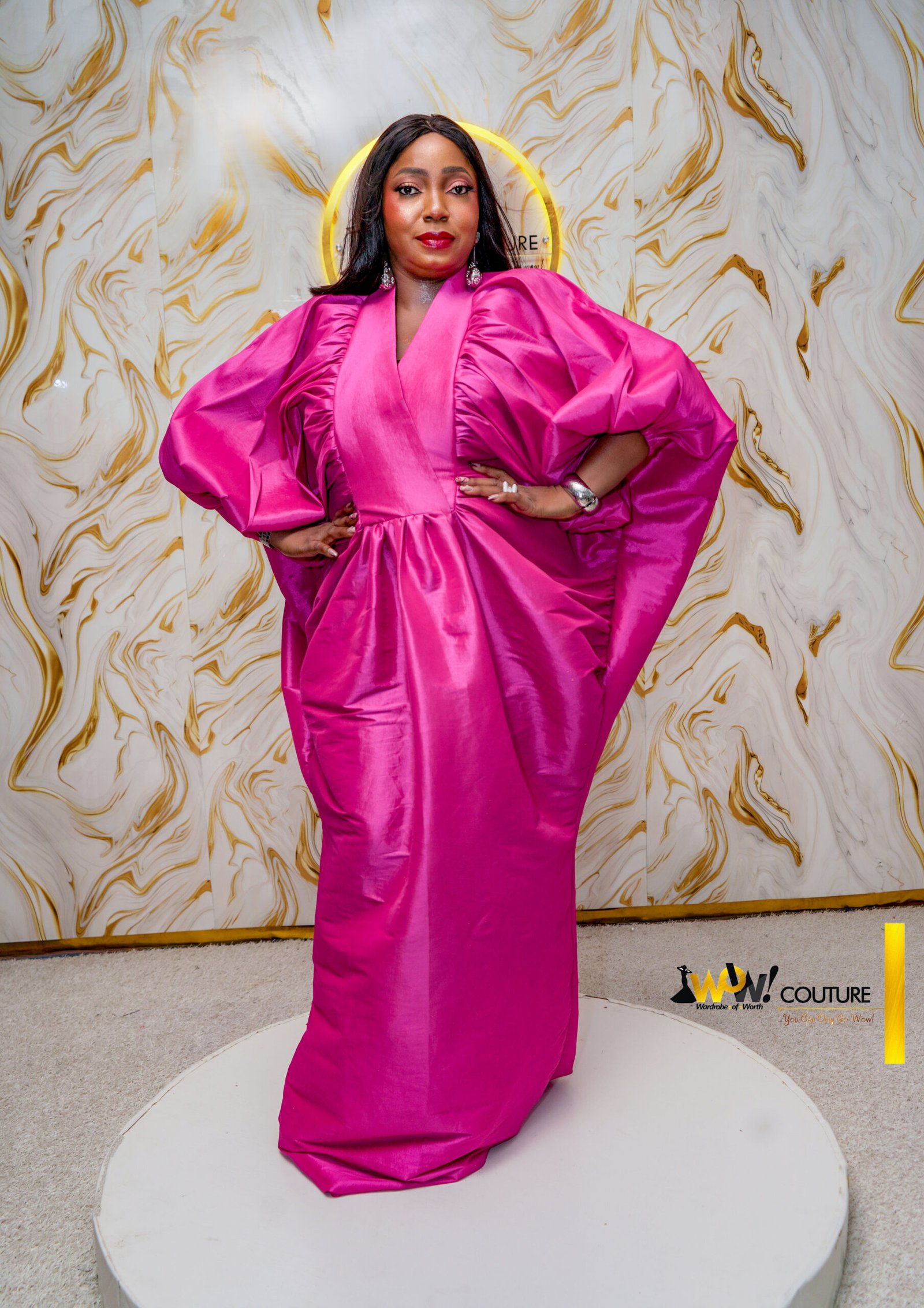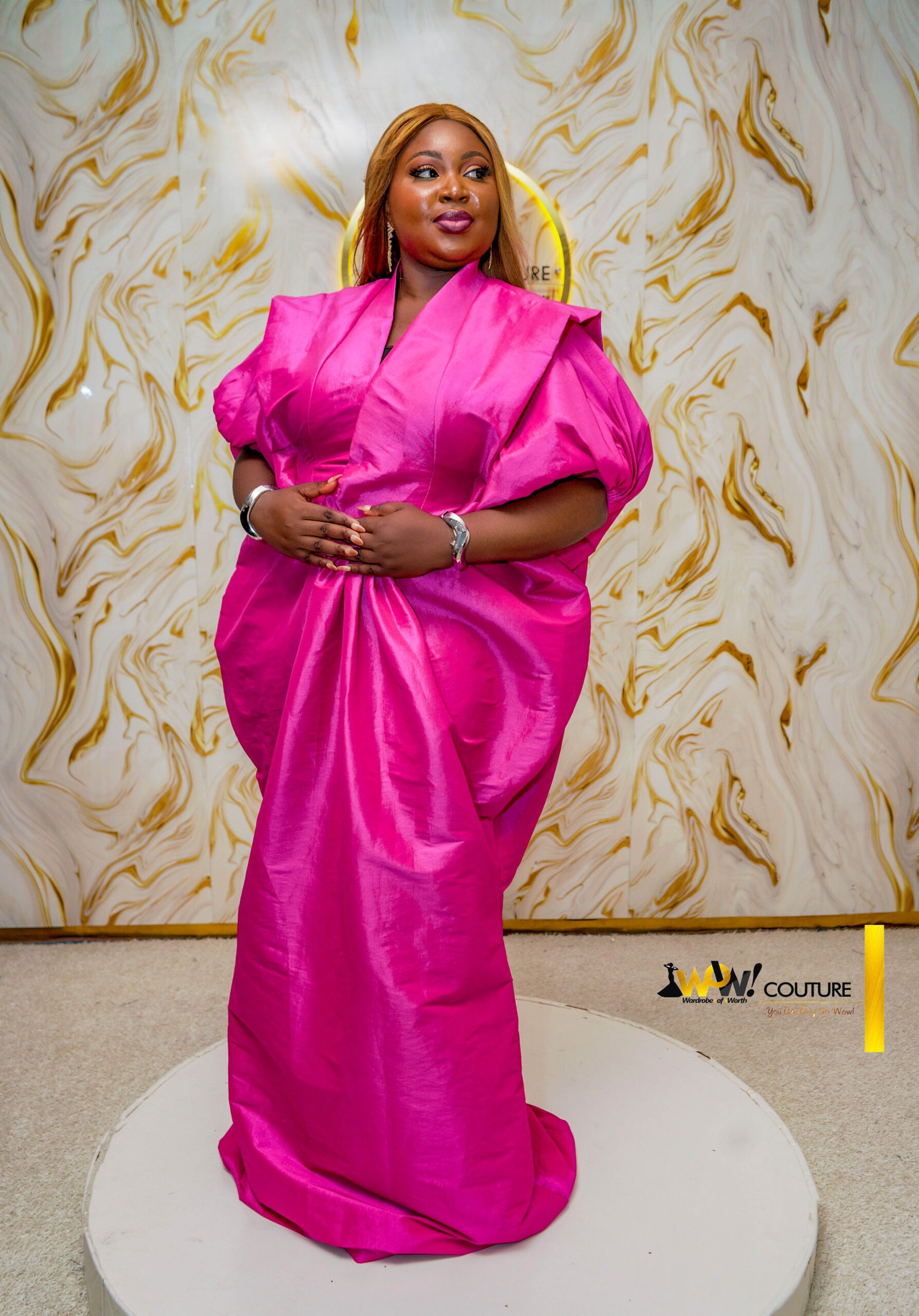 Turn heads and command the room in this breathtaking fuchsia statement gown. Designed for the woman who isn’t afraid to take up space, this piece blends architectural drama with effortless elegance